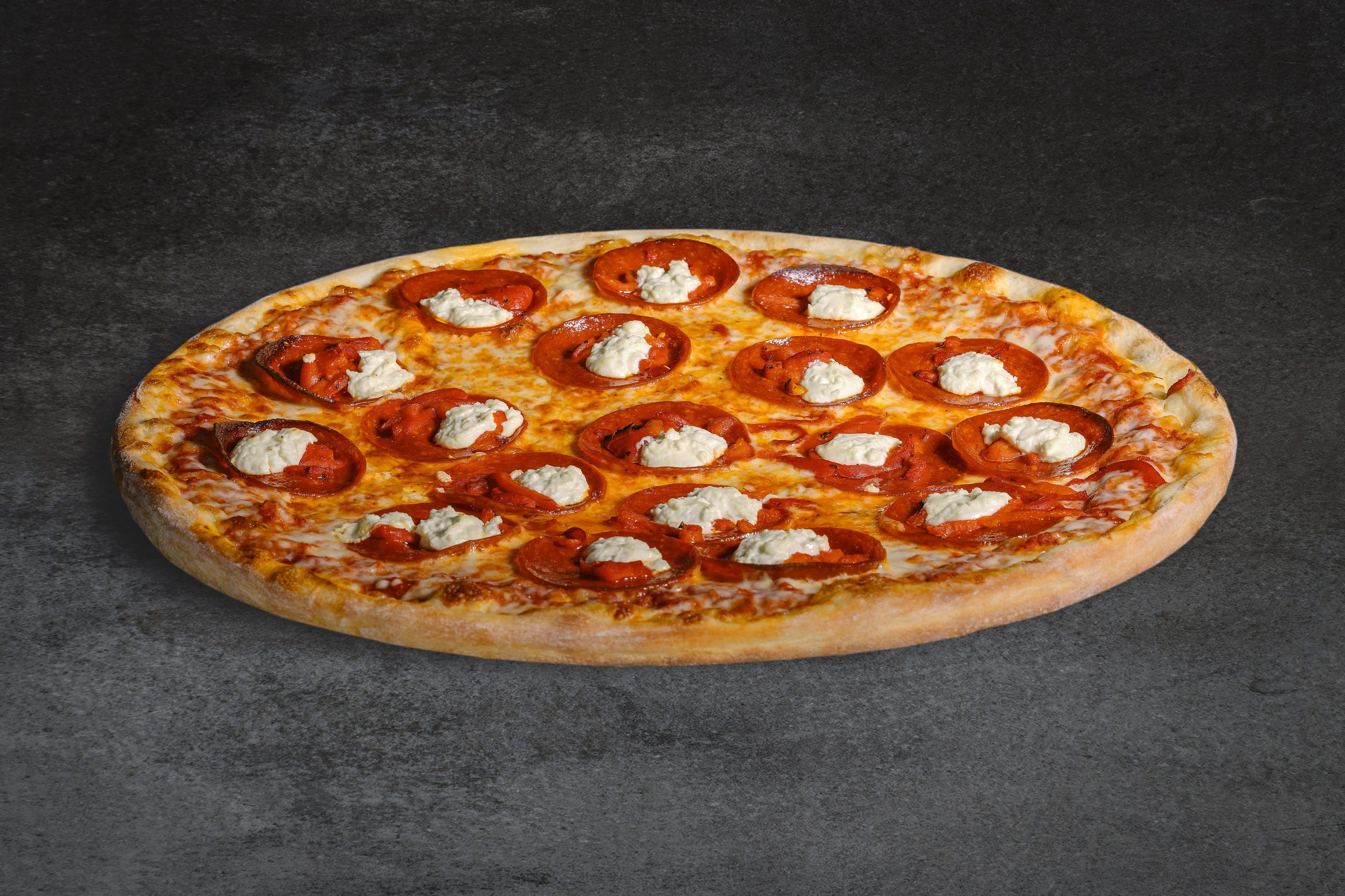Gourmet Italian pepperoni, goat cheese & tangy roasted red pepper