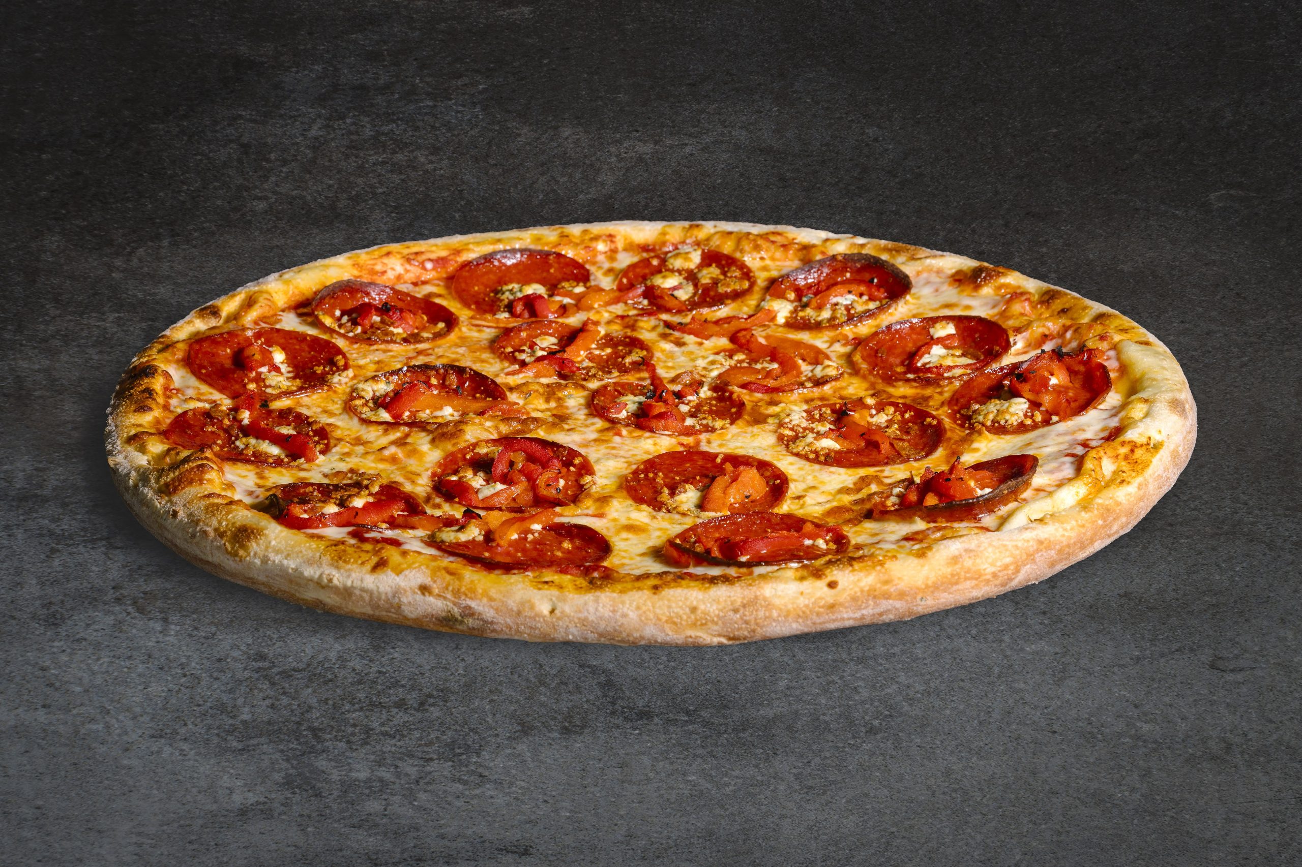 Gourmet Italian Pepperoni, Gorgonzola cheese, tangy rosted red pepper, deep fried pepperoni chips