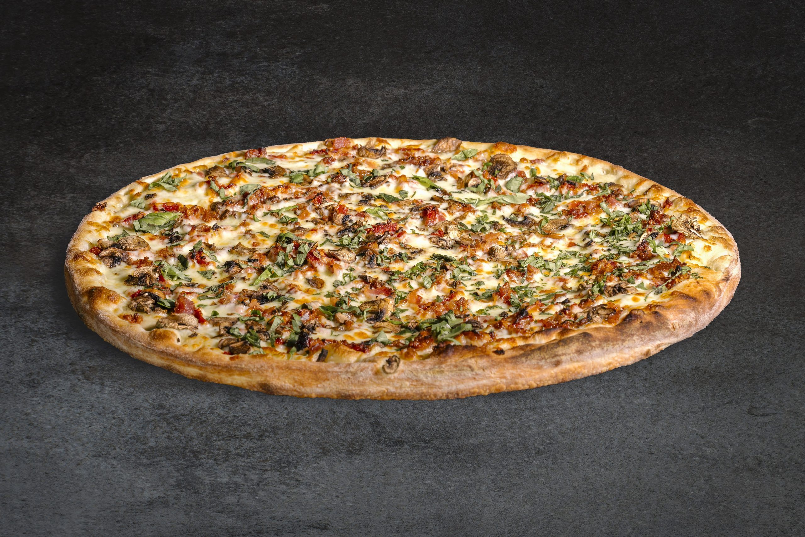 White Truffle, mushroom, bacon, sun dried tomato mozzarella & fresh basil